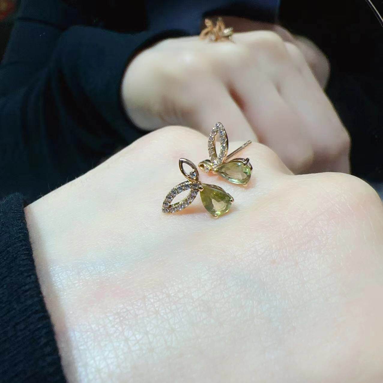 新品18K金黄镶嵌天然黄蓝宝石耳钉水滴形女人味国产山东蓝宝石