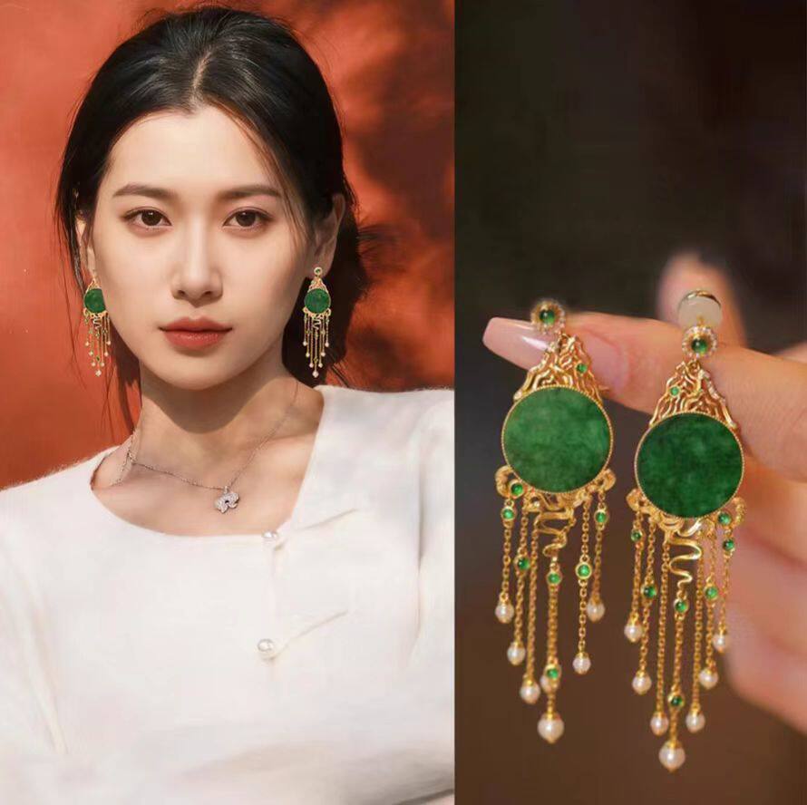 新中式国风流苏法祥云仿翡翠耳环旗袍女耳钉耳饰独特复古长款简约