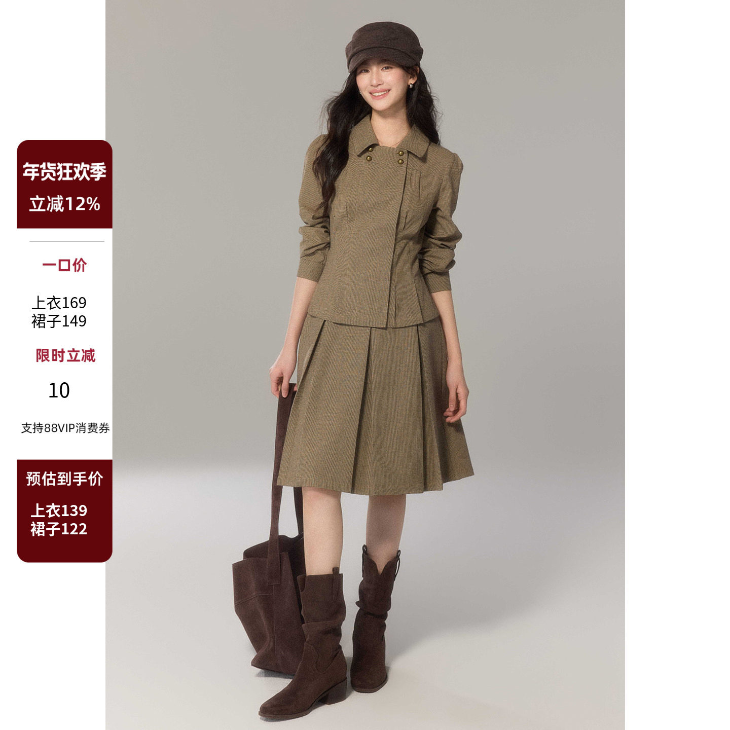 贰羊设计【嘉宜】复古彼得潘领格纹衬衫女双排扣上衣半裙通勤套装