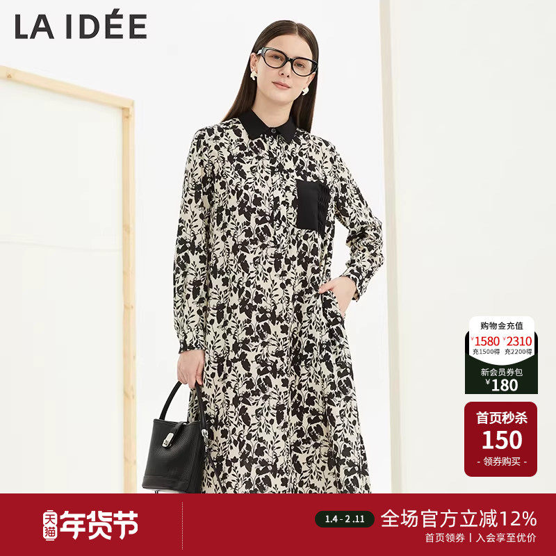 LAIDEE/罗兰伊杜衬衫连衣裙撞色不规则印花文艺连衣裙气质蓬松裙