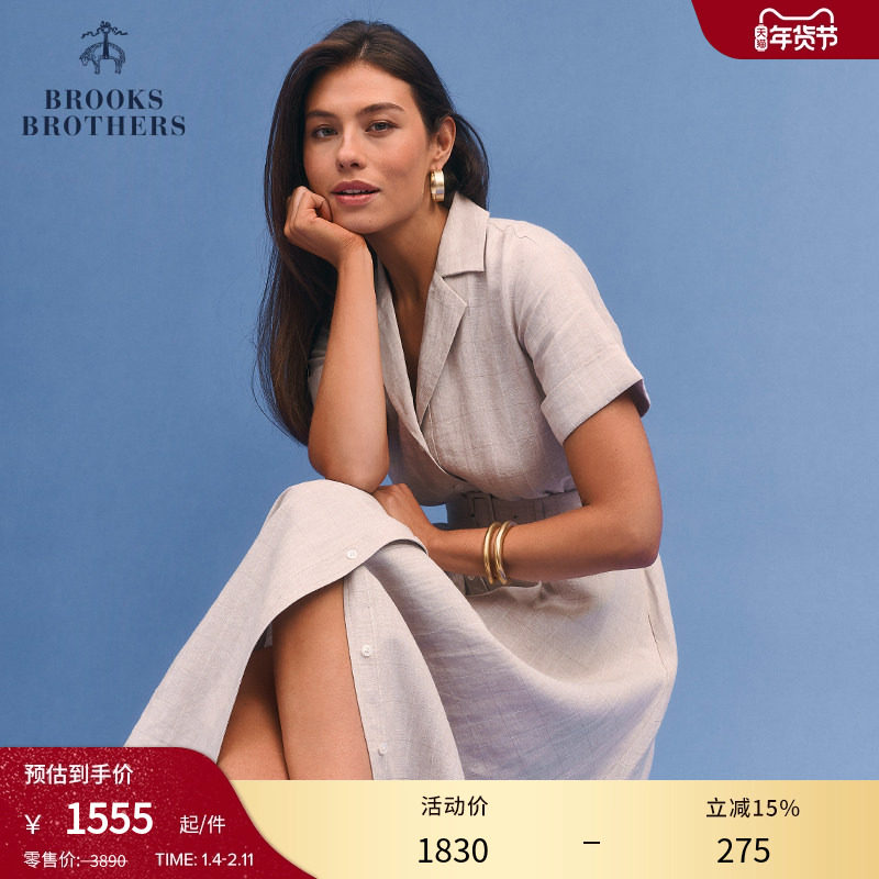 Brooks Brothers/布克兄弟女士春夏新款亚麻翻领收腰文艺连衣裙