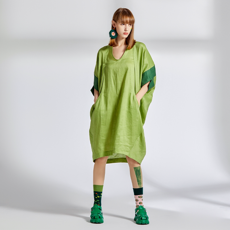 原创夏季果绿色V领文艺连衣裙女宽松大码慵懒风气质小众茶歇裙子