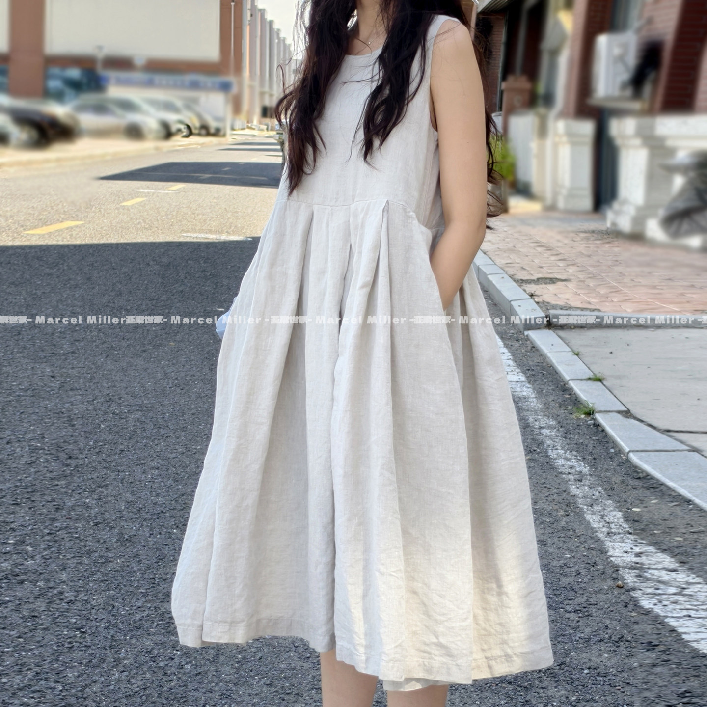 刚巧遇见 双层亚麻无袖大摆裙 春秋可叠穿宽松文艺连衣裙温润麻色