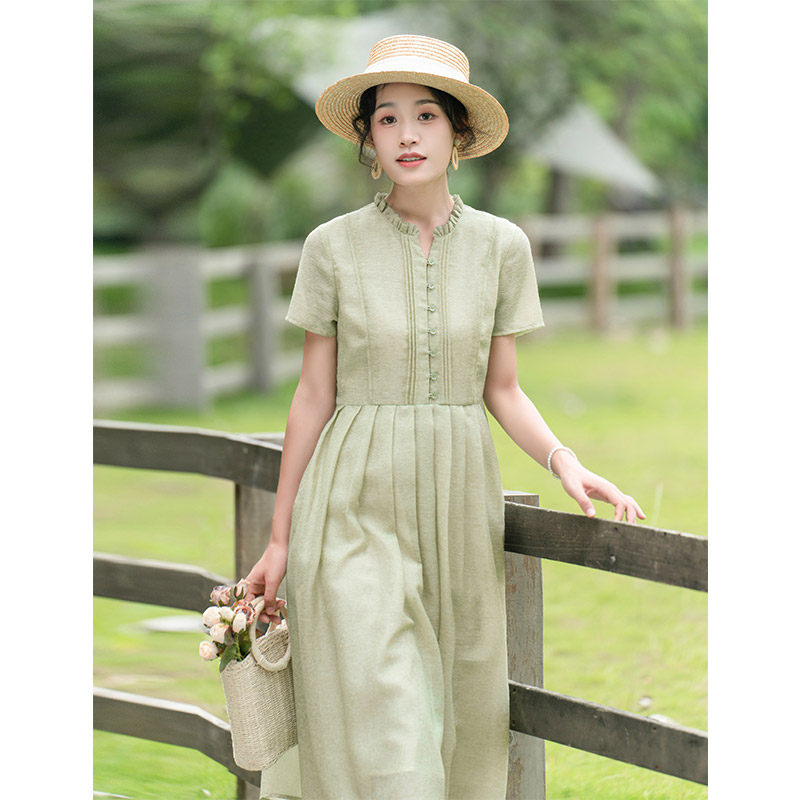 纻衣绿色V领荷叶领文艺连衣裙女2026夏新品款温婉淑女减龄中长裙