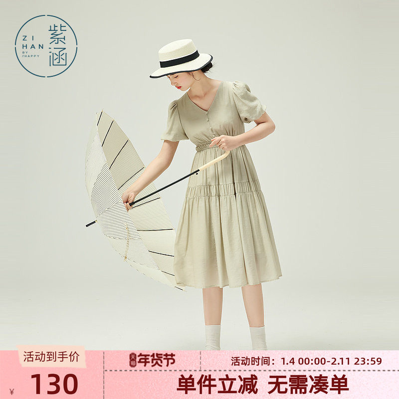 紫涵V领文艺连衣裙A字散摆中长裙女夏季新款简约休闲森系显瘦裙子