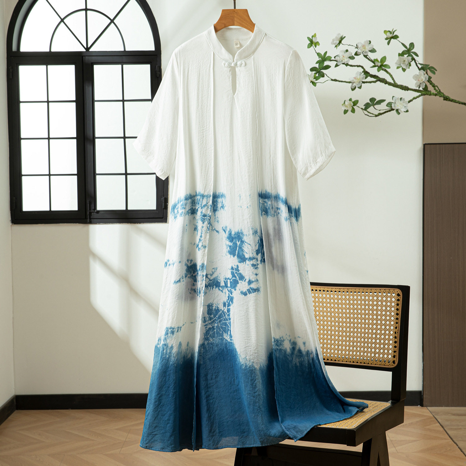 云南手工扎染新中式改良汉服文艺连衣裙女春夏季棉绸盘扣国风长裙