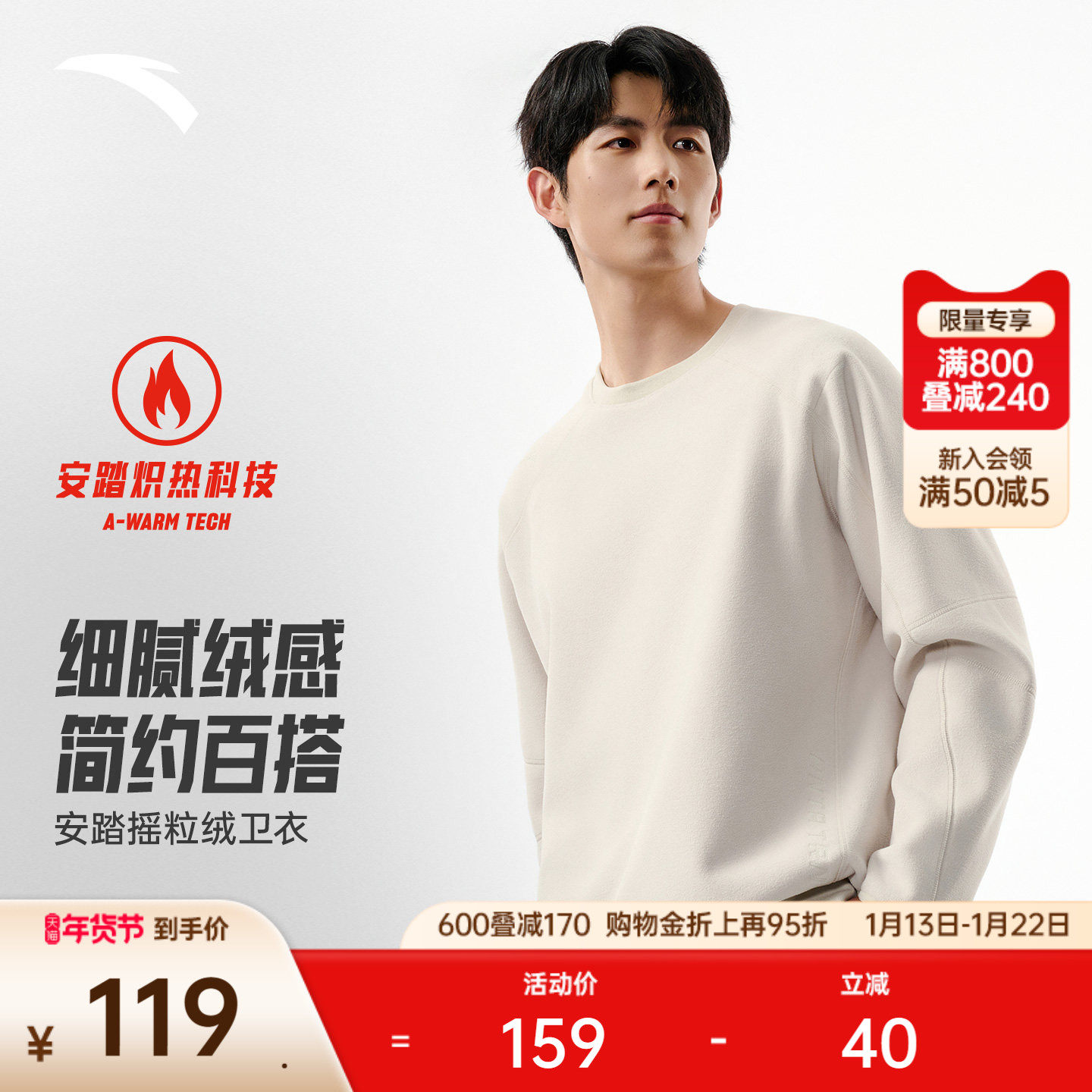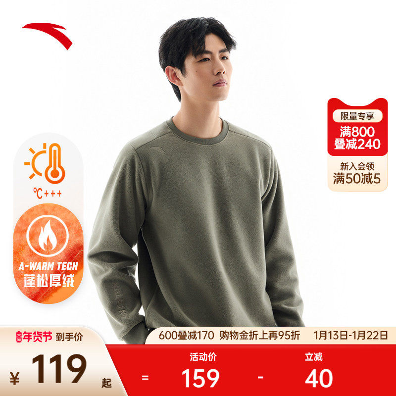 安踏摇粒绒圆领套头卫衣男士冬季新款保暖抓绒衣冲锋衣内胆打底衫