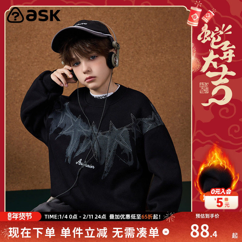 ask新年拜年服儿童卫衣2025冬季新款打底衫T恤男童加绒套头衫上衣