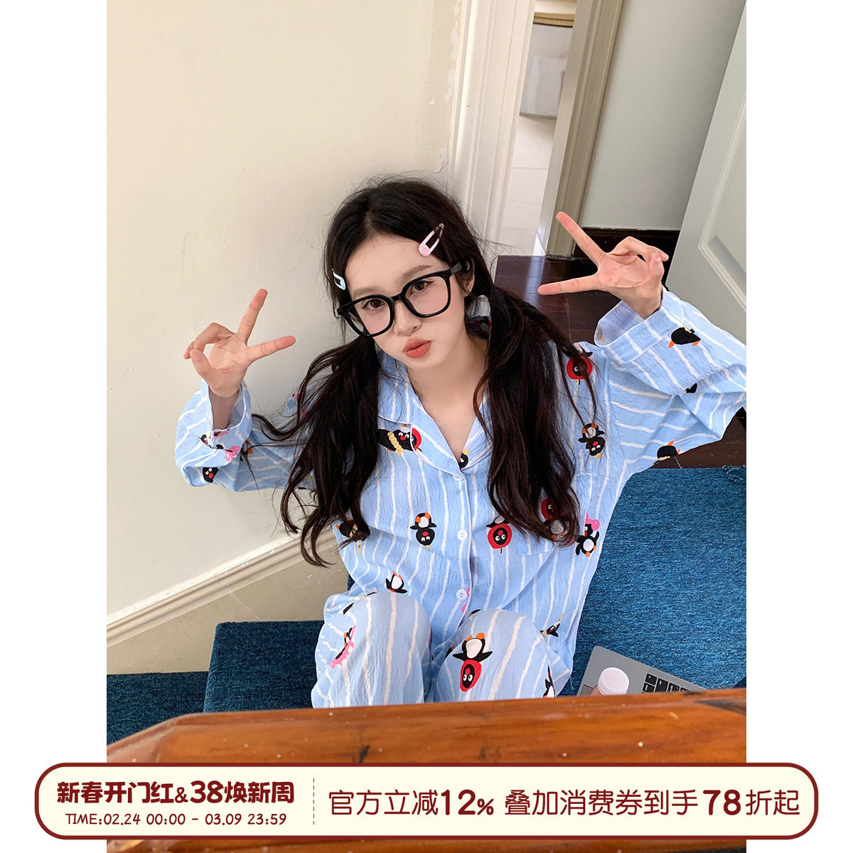 馨帮帮Homedress 薄款卡通条纹长袖睡衣女秋季学生可爱家居服套装