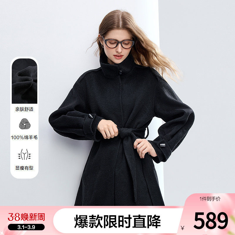 betu百图黑色立领纯羊毛呢子大衣女2025年冬季新款双面呢外套