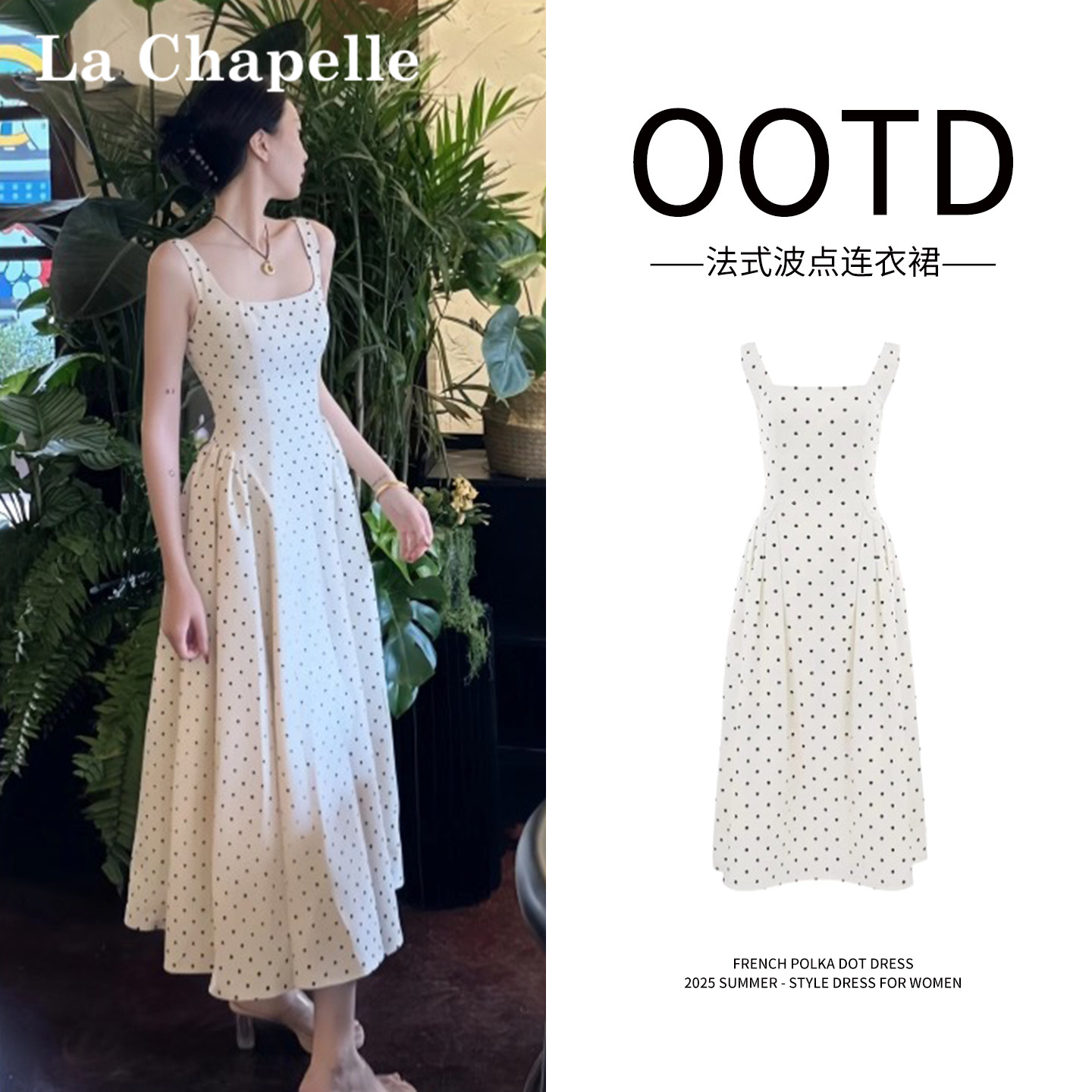 拉夏贝尔白色波点连衣裙女夏季新款宽肩带收腰方领法式吊带中长裙