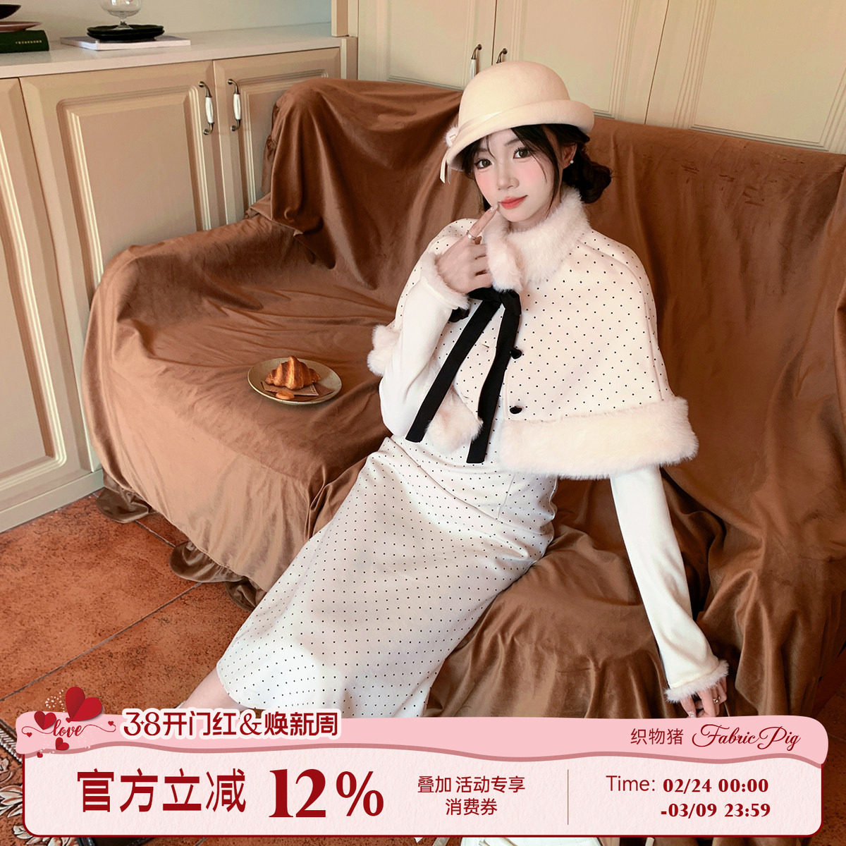 【直播间专属】织物猪 都市甜心 千金风波点连衣裙miu系斗篷长裙