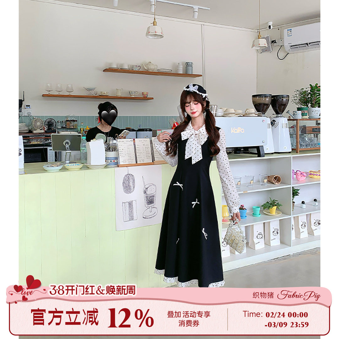 织物猪 黑雪浮光 千金风假两件波点连衣裙女春季黑白撞色气质长裙