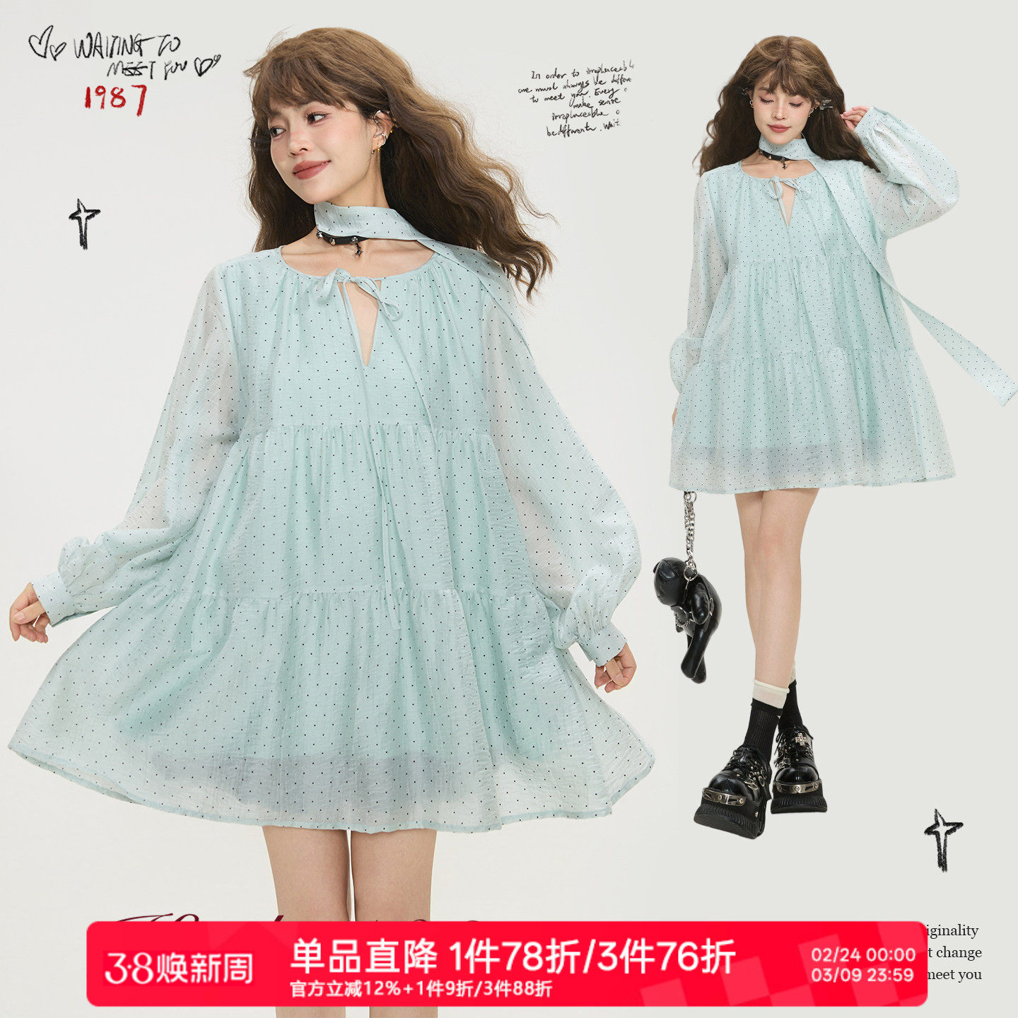织物猪 薄荷奶糖 甜美学院风波点连衣裙女春季蝴蝶结减龄蛋糕短裙