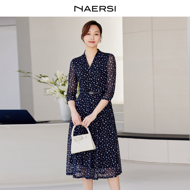 NAERSI/娜尔思时尚气质V领波点连衣裙春秋秋季新款裙子(配腰带)
