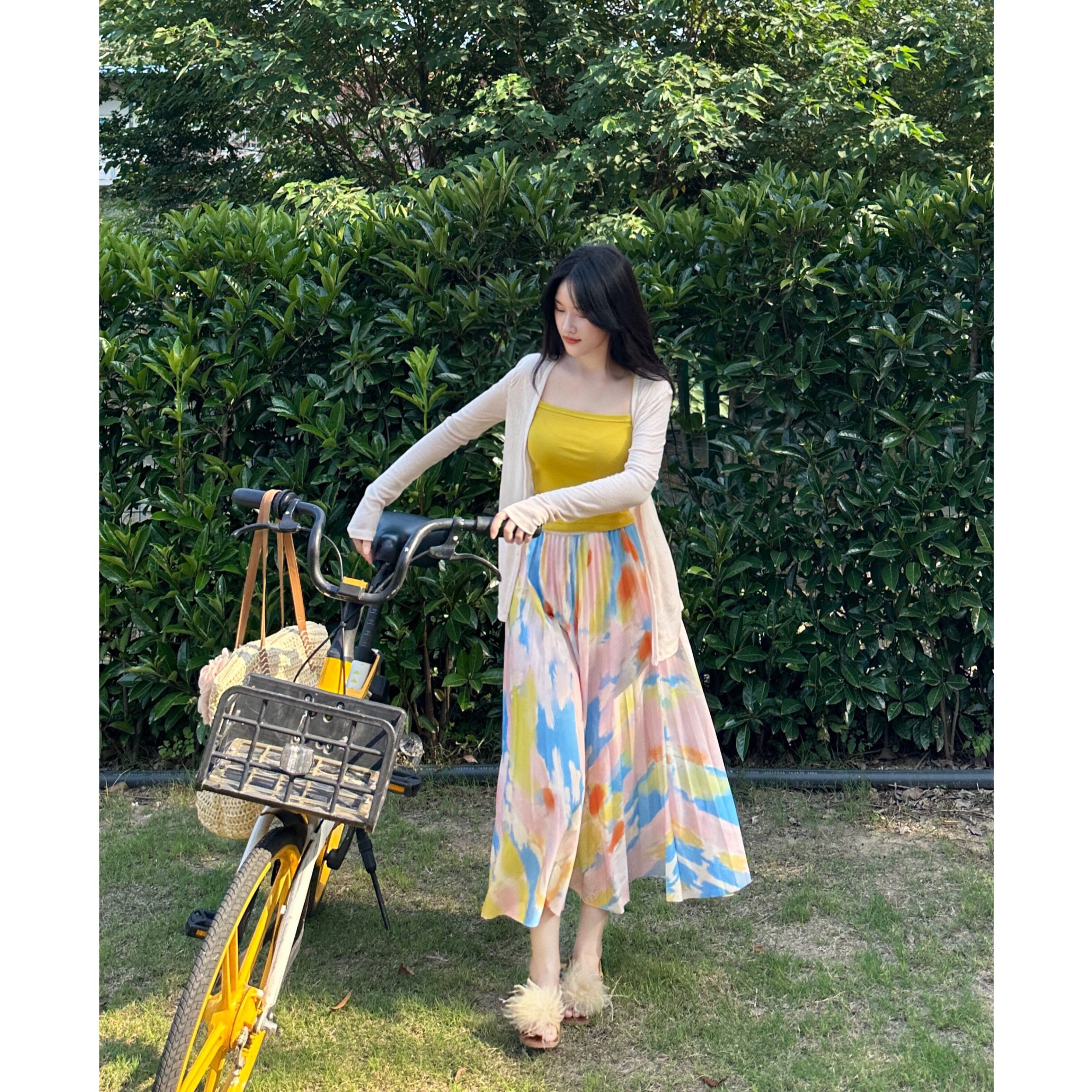 晚时光 6.15 文艺拼色图案高腰半身裙 夏季中长款显瘦百褶裙