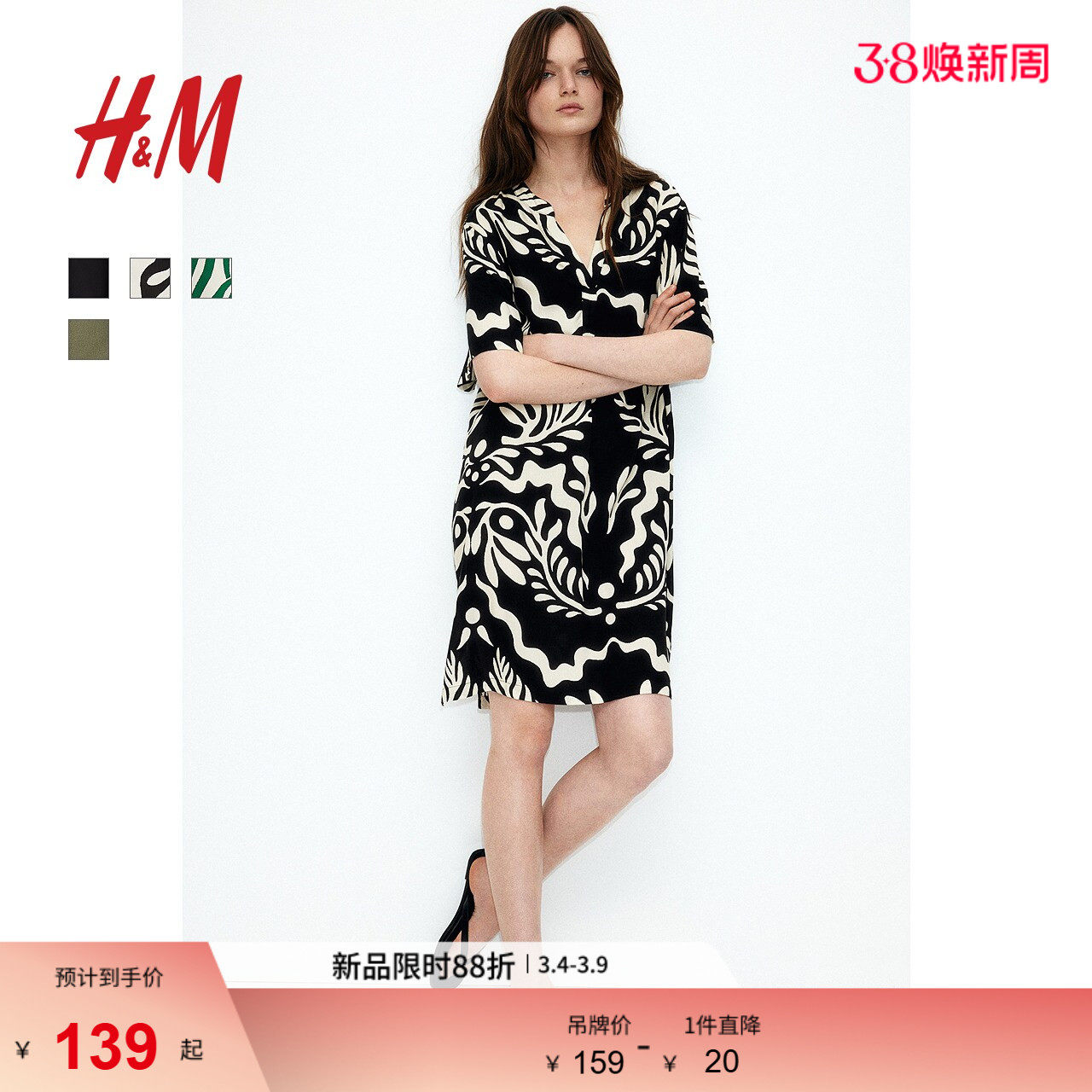 HM女装连衣裙夏季松弛慢人风中式收腰立领碎花度假风裙1214786