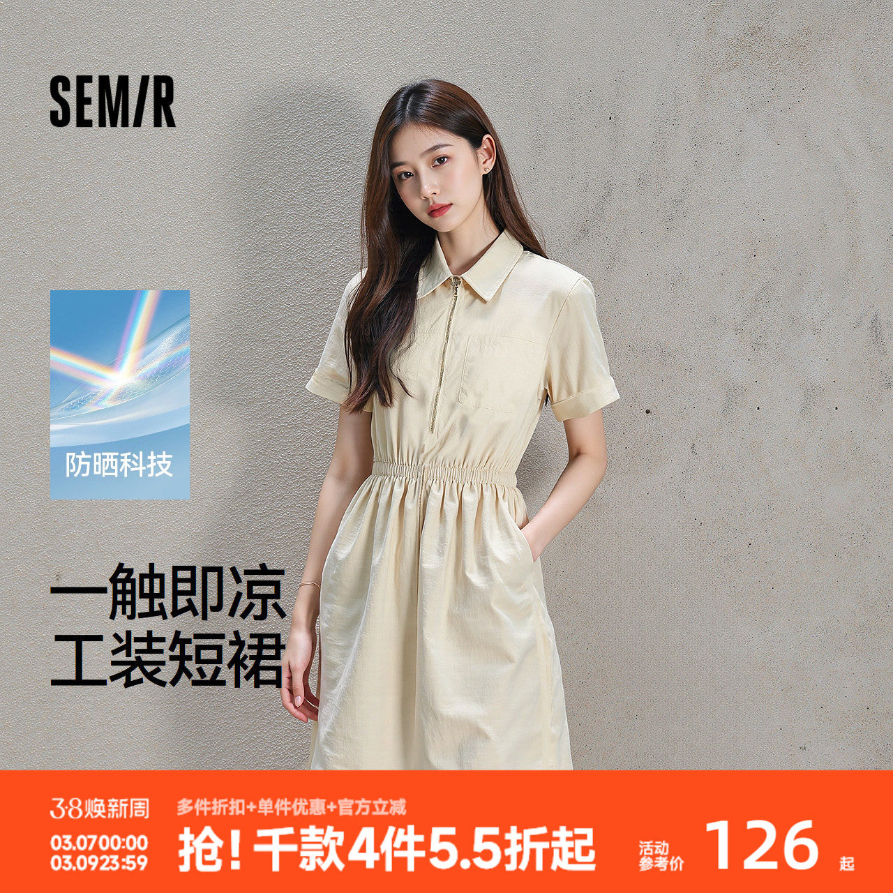 森马连衣裙女夏季翻领抽绳收腰防晒凉感肌理工装裙简约风户外短裙