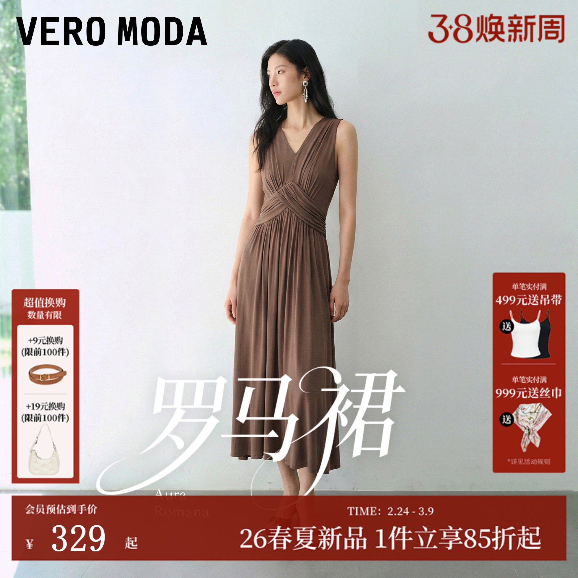 【罗马裙】VeroModa连衣裙女26夏季无袖V领捏褶收腰通勤长裙优雅