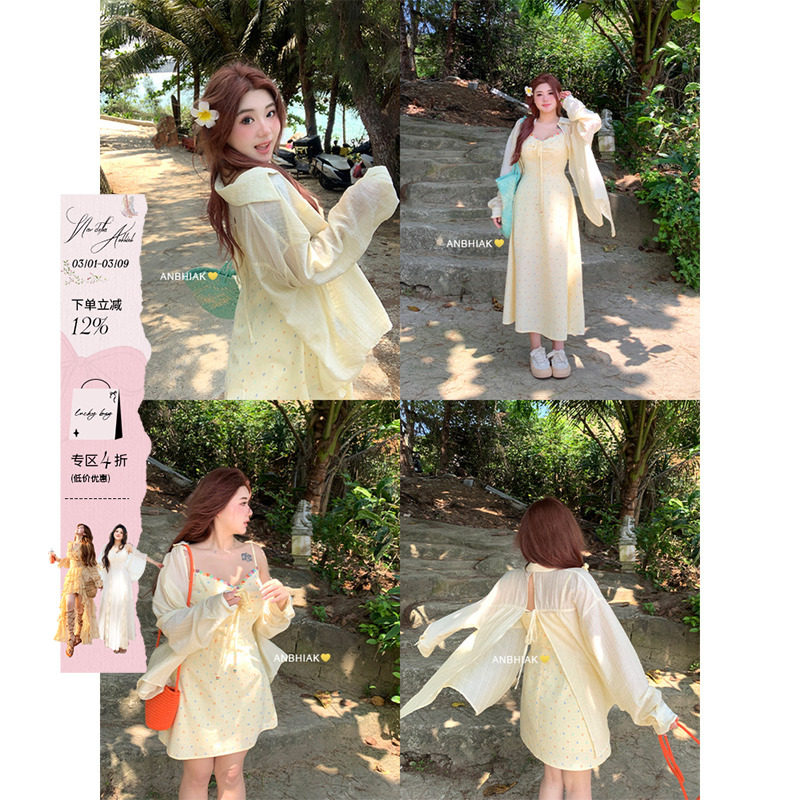 安妮不火 度假风花边连衣裙女2024夏季新款微胖大码碎花吊带裙子