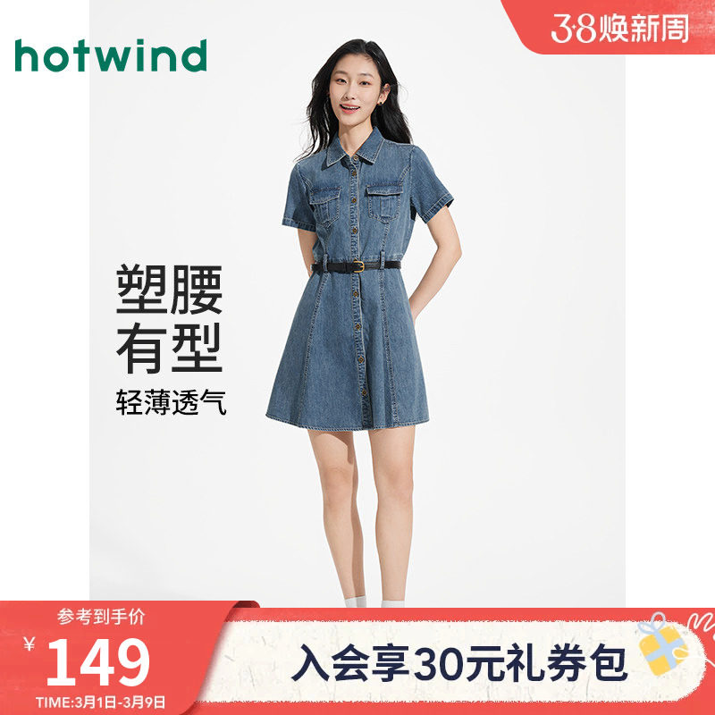 热风牛仔连衣裙2026年夏季新款女士收腰连衣裙美式复古修身衬衫裙