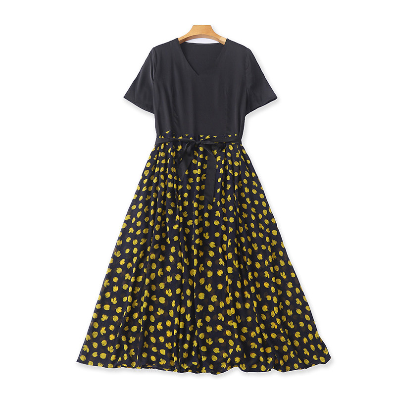 外贸V领拼色系带连衣裙 夏季新款气质短袖女套头长款A字裙子04222