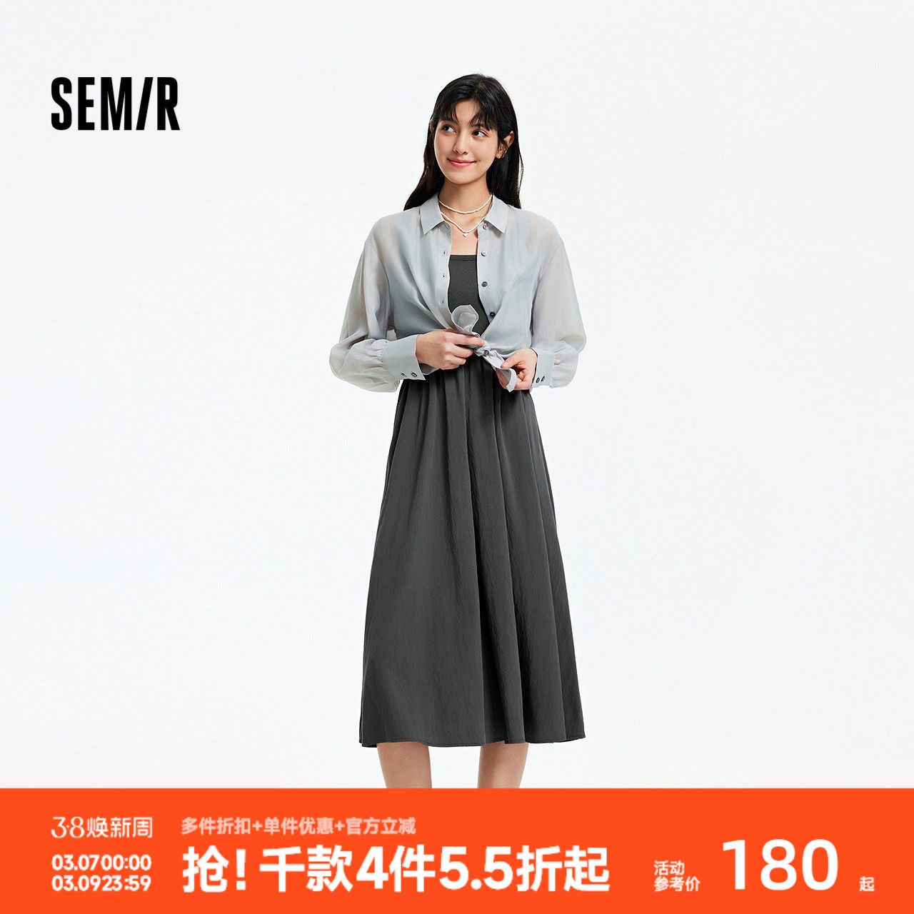 森马连衣裙女夏季U领吊带裙肌理翻领衬衫通勤简约风松弛感两件套