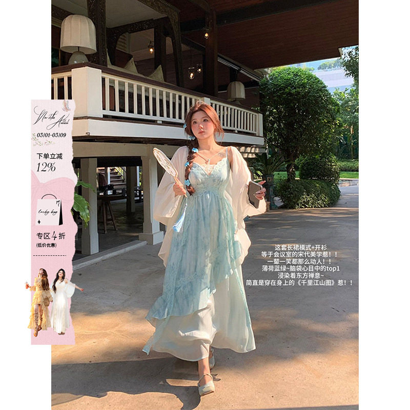 安妮不火纸舟渡松烟蕾丝花边扎染吊带裙女夏季新款微胖大码国风裙