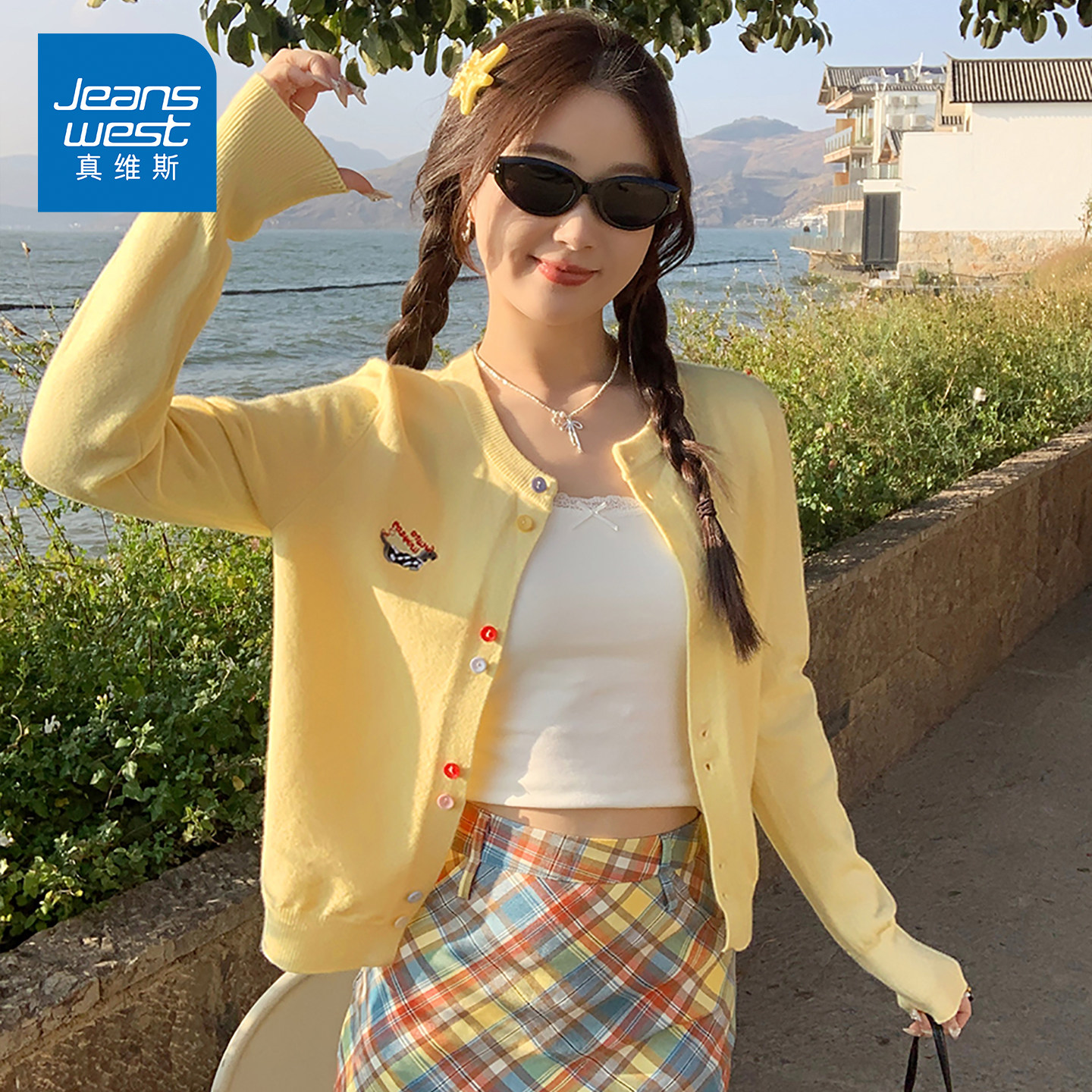 KP真维斯韩系黄色针织开衫女秋季多巴胺圆领刺绣毛衣外套百搭上衣