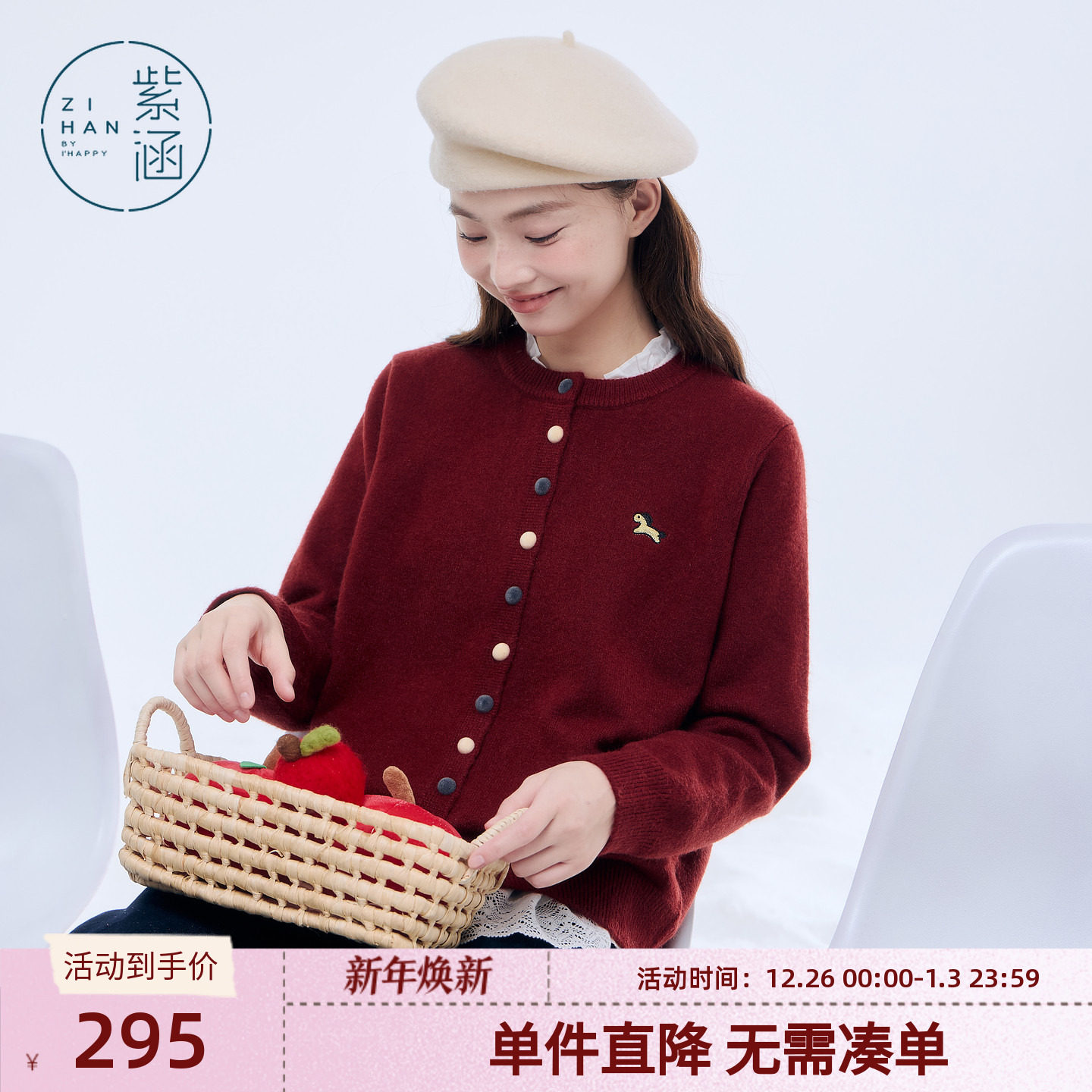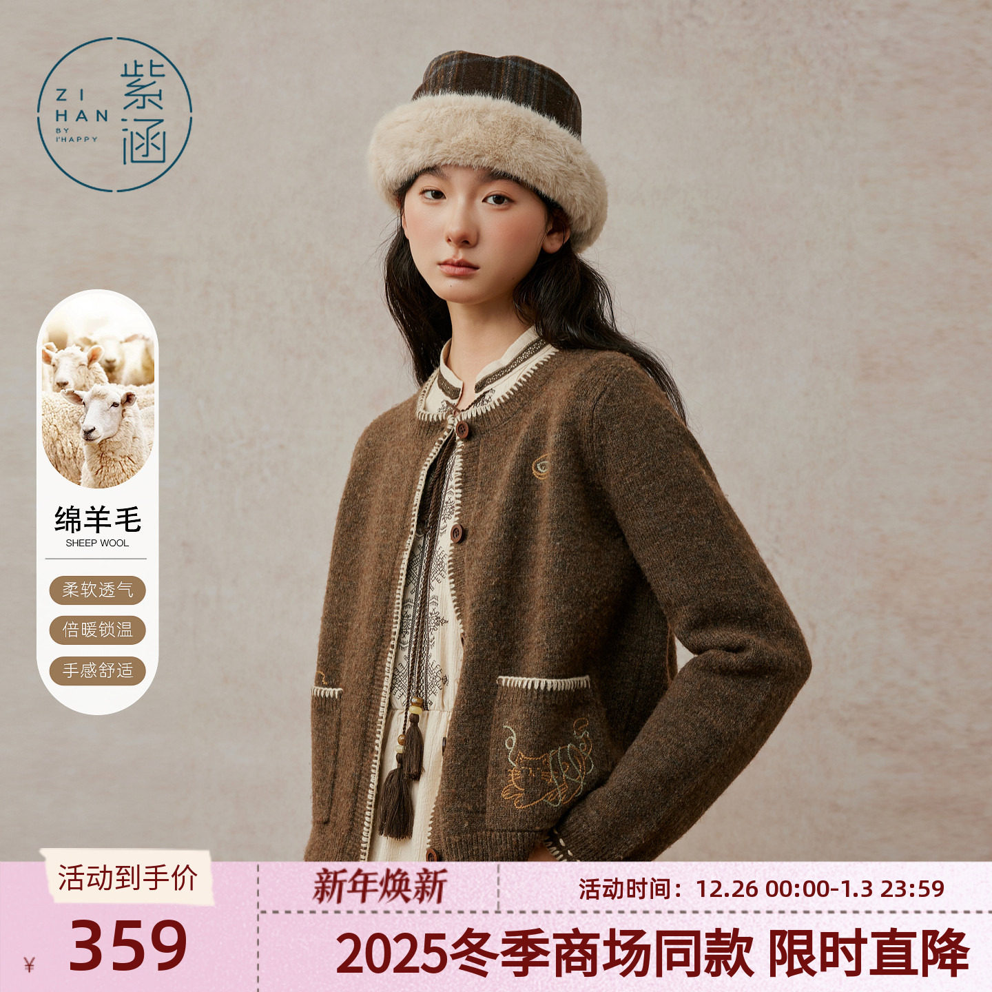 紫涵羊毛圆领针织开衫女2025年冬季新款复古撞色锁边刺绣毛衣外套