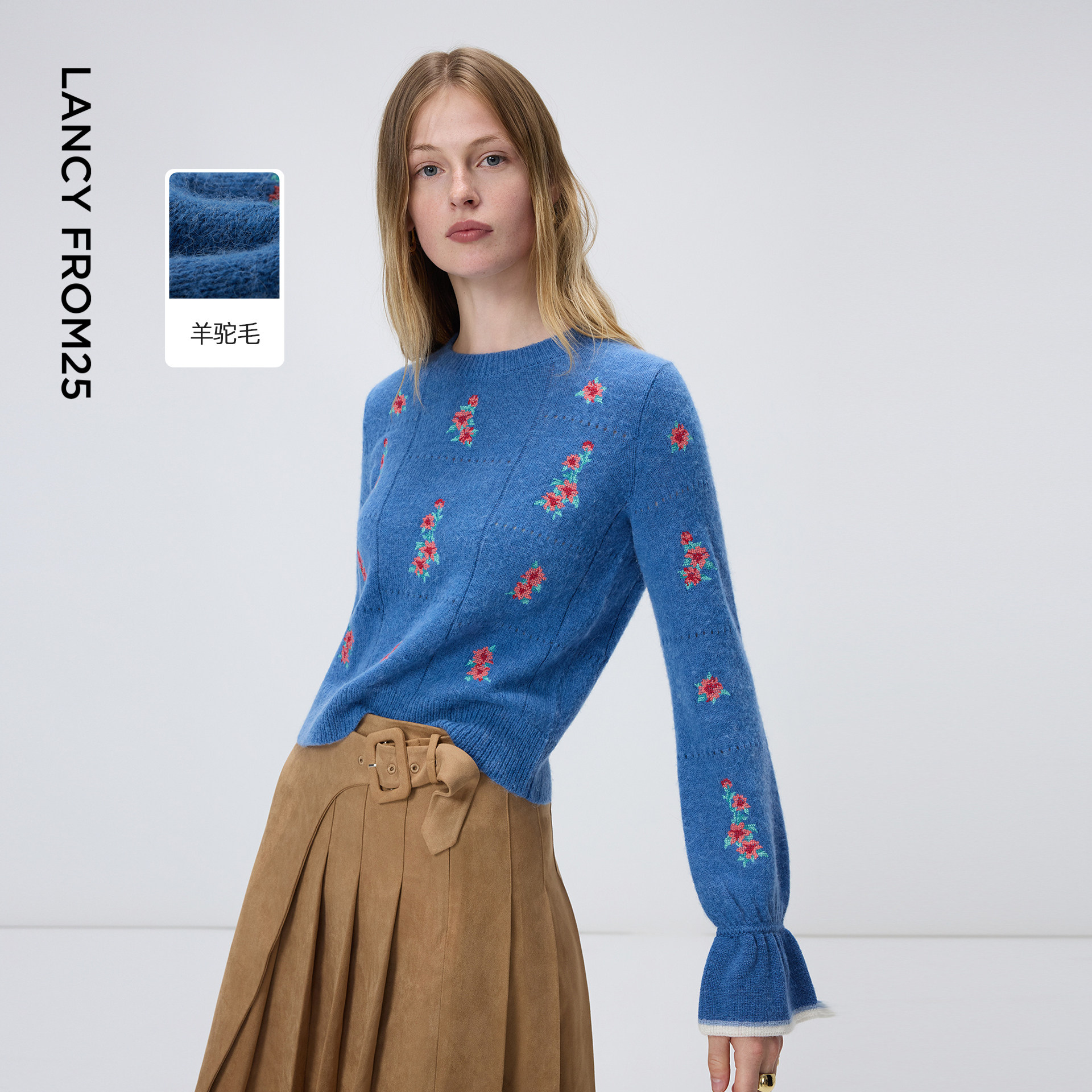 朗姿羊毛圆领刺绣毛衣法式毛针织衫修身通勤上衣2026年春季新款女