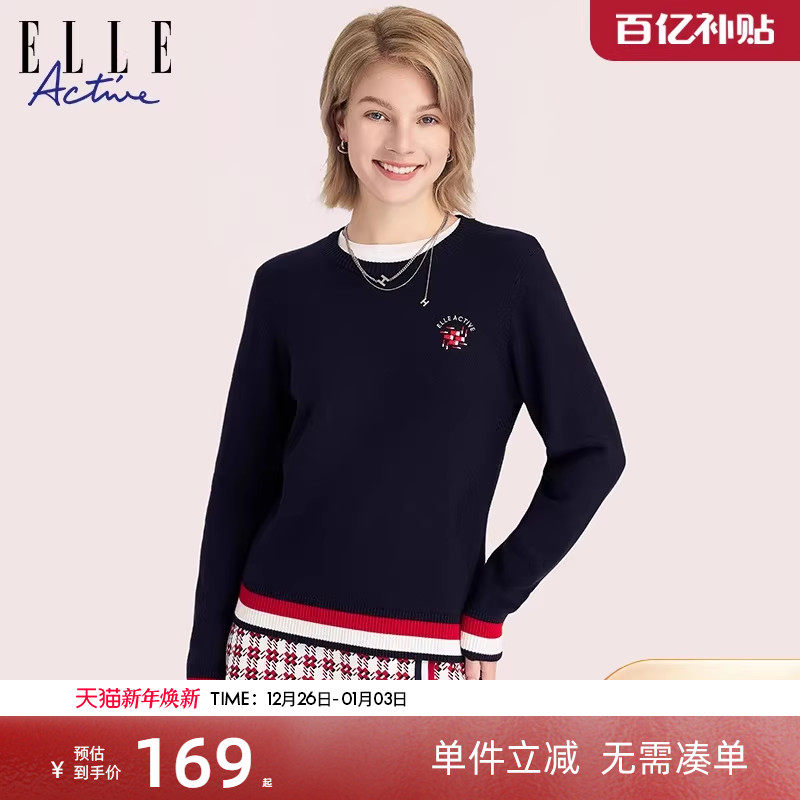 ELLE Active新款休闲纯色刺绣毛衣针织衫圆领撞色长袖打底衫女