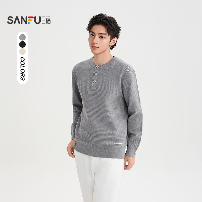 三福2025冬季新款男士亨利领刺绣毛衣都市宽松套头上衣毛衫506162