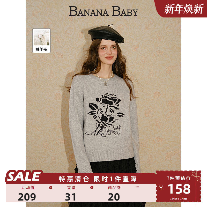 【绵羊毛】BANANA BABY2025年冬季新款格雷系提花刺绣毛衣女套头