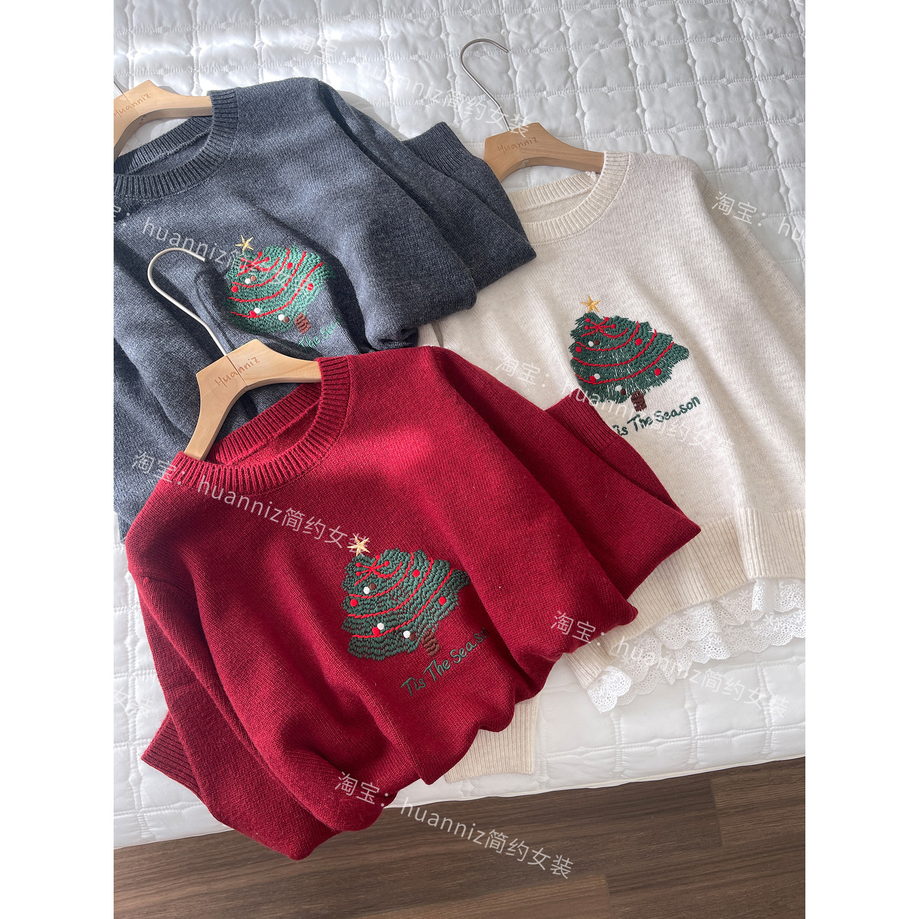 节日氛围感圣诞树刺绣毛衣冬假两件蕾丝花边拼接圆领针织衫上衣女