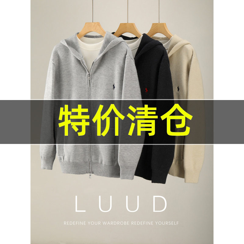 特价 松弛慵懒风双拉链北极绒连帽针织开衫男冬骑士刺绣毛衣外套