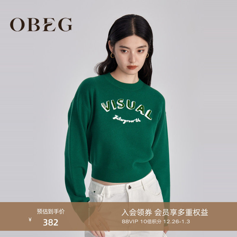 OBEG欧碧倩字母提花短款刺绣毛衣女冬季款套头羊毛衫10444049