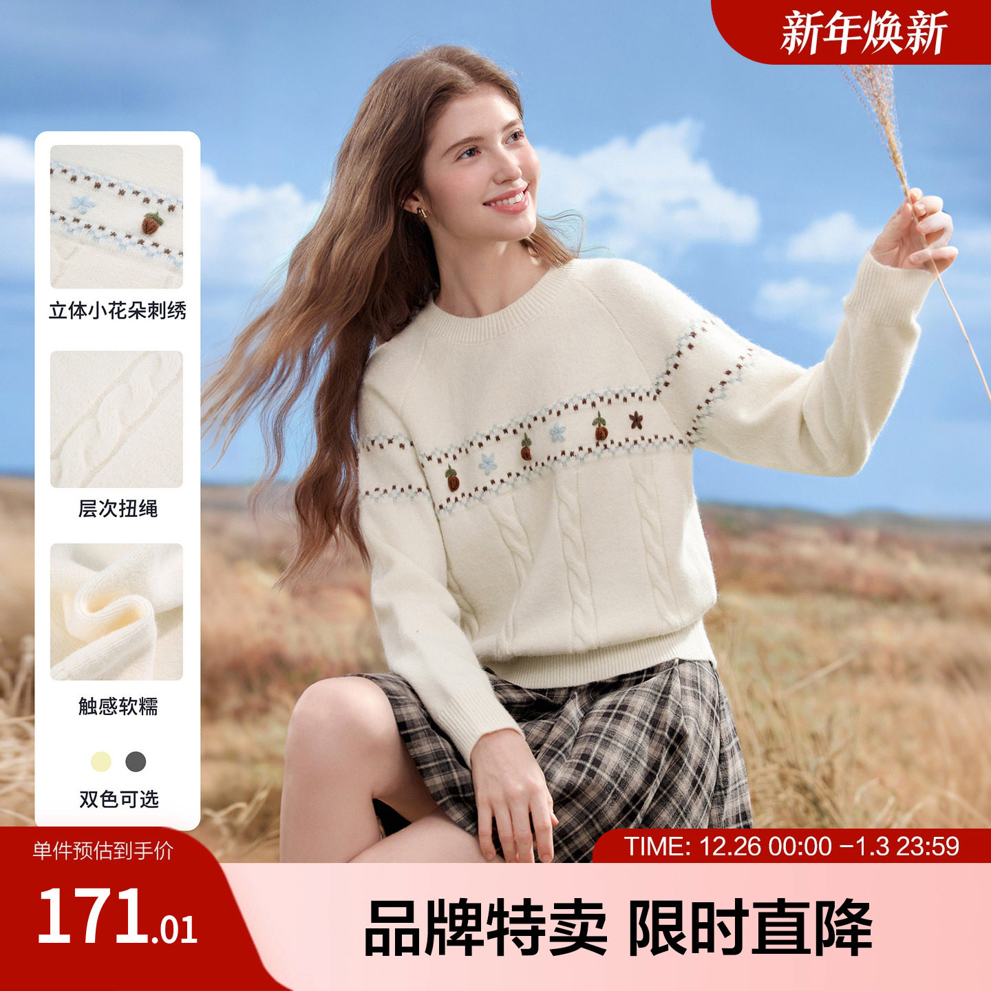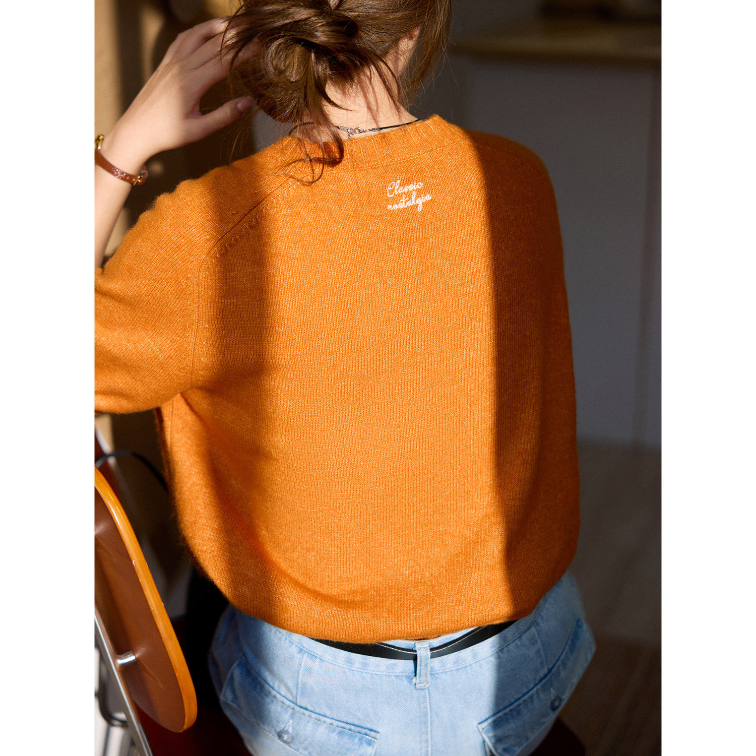 Basic House/百家好圆领卡通刺绣毛衣秋冬减龄纯色插肩袖上衣2025
