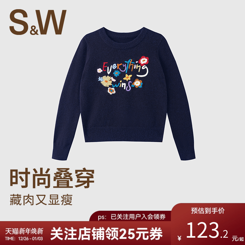 SW速惟高级感刺绣毛衣女2025新款冬圆领慵懒上衣内搭打底衫可外穿