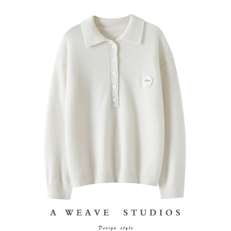 Basic House/百家好秋冬卡通刺绣毛衣女圆领单排扣宽松可爱外套
