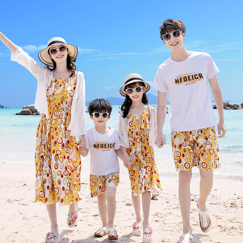 亲子装一家三口夏季新款沙滩母女吊带连衣裙海边度假母子休闲衬衫