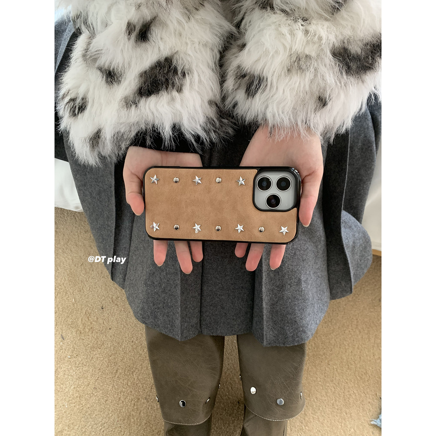 DT play 星星铆钉甜酷皮质褶皱纹理韩国ins博主小众设计适用于iphone17promax/16/15苹果14/13手机壳保护套