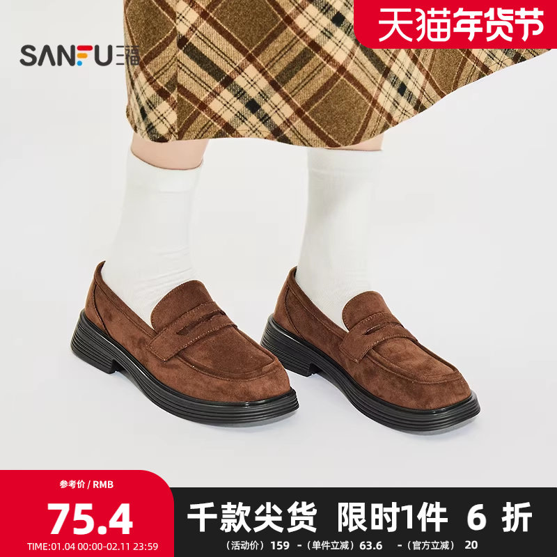 三福女乐福鞋秋季智性学院英伦复古风纯色圆头休闲女鞋848381