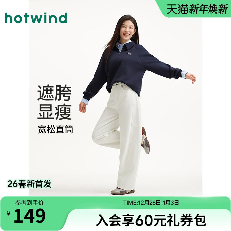 热风女士牛仔裤白色长裤2026年春季新款宽松廓形牛仔裤直筒长裤
