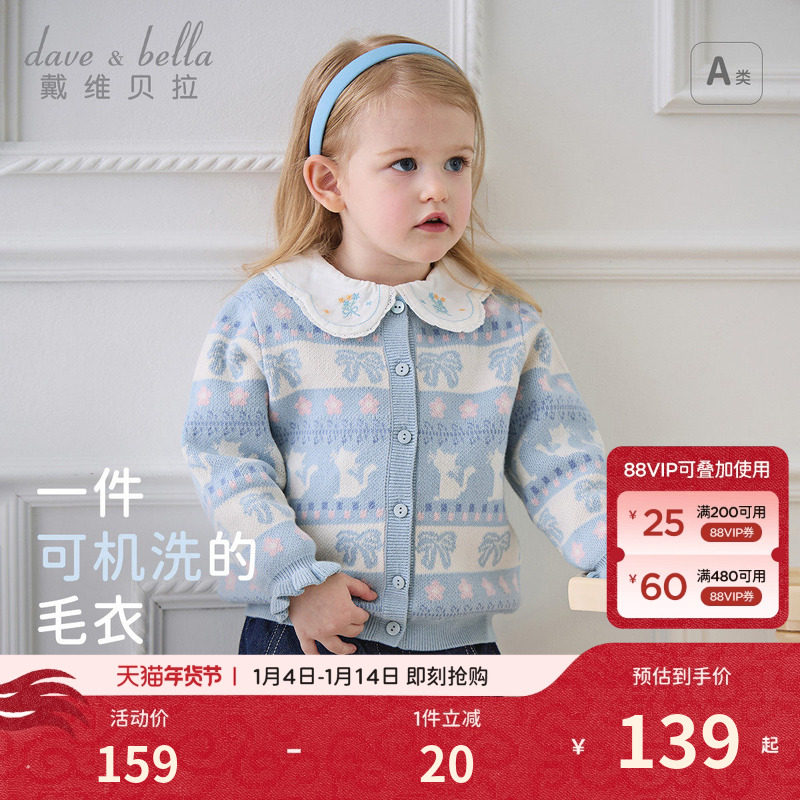 戴维贝拉儿童抗静电毛衣女童A类纯棉针织衫2026春新款女宝宝外套