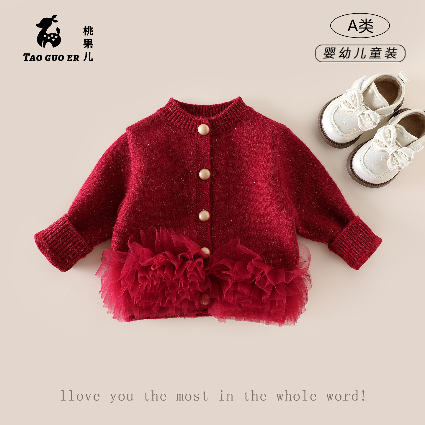 女童红色毛衣女宝宝外套冬装保暖针织开衫儿童冬季拜年服周岁礼服