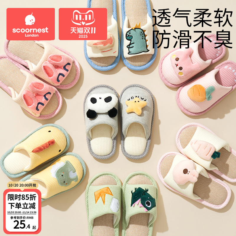 四季通用棉麻布拖鞋女春秋款吸汗脚亚麻卡通可爱办公室内居家地板