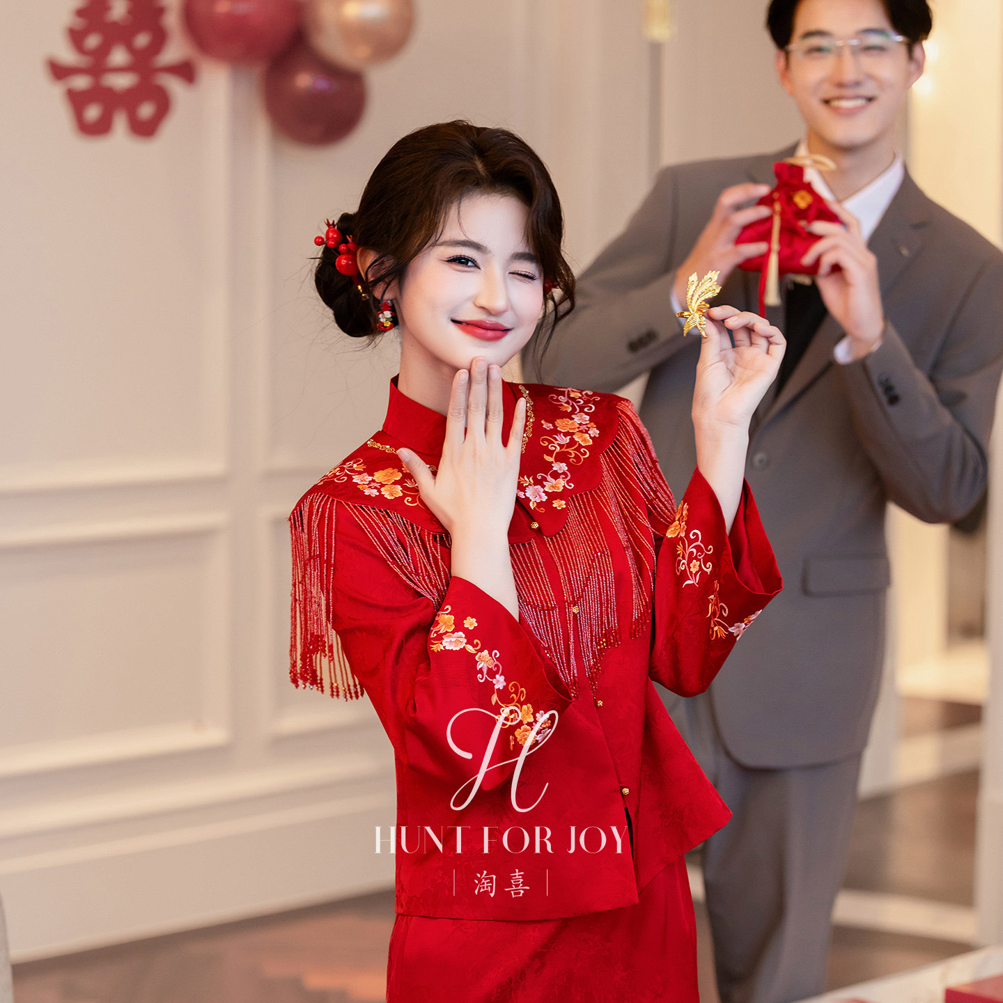淘喜原创「宁洛」红色出阁新中式流苏披肩套装新娘旗袍敬酒服礼服