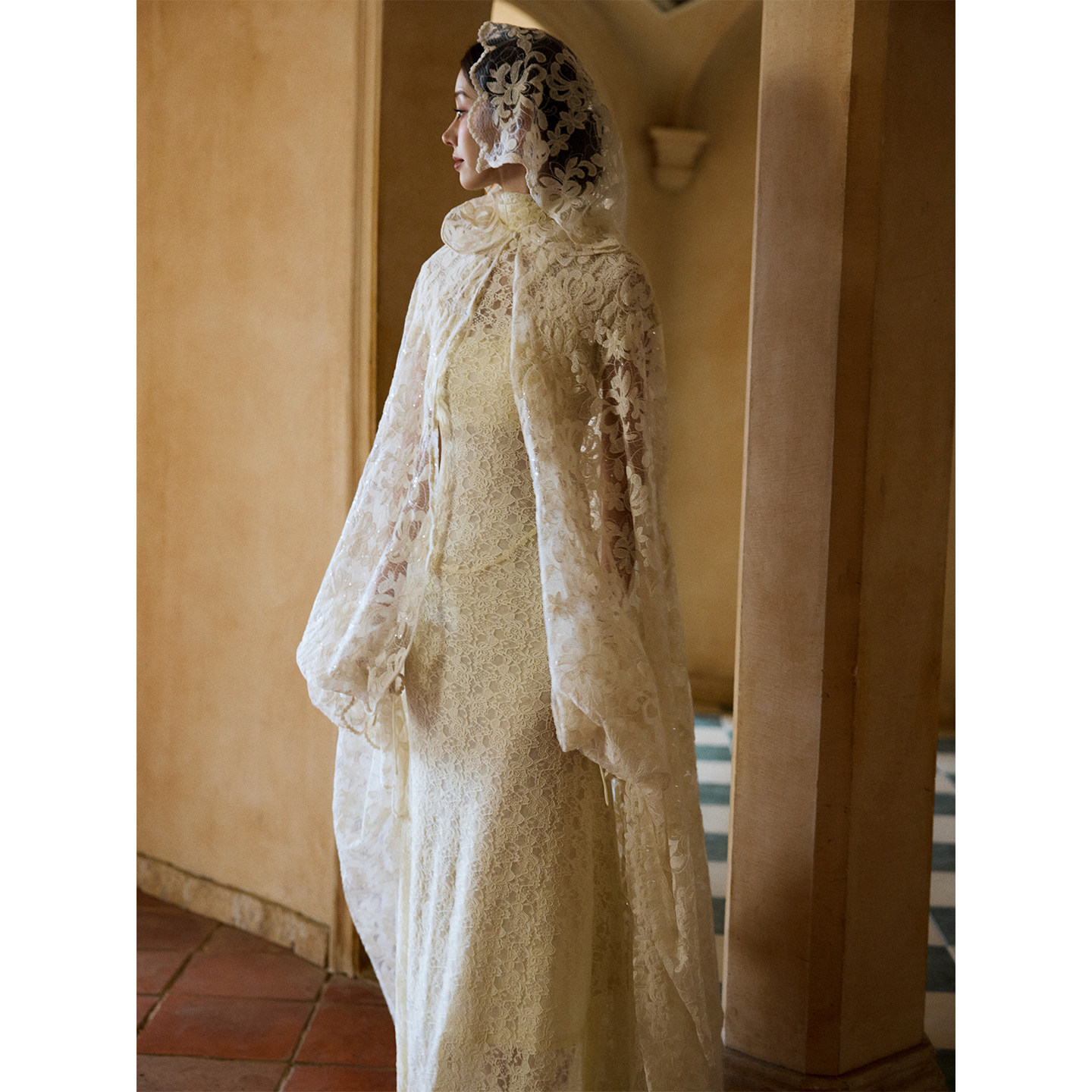 ONMOON 春夏米白法式蕾丝镂空披肩斗篷 复古轻婚纱薄订婚服晨袍