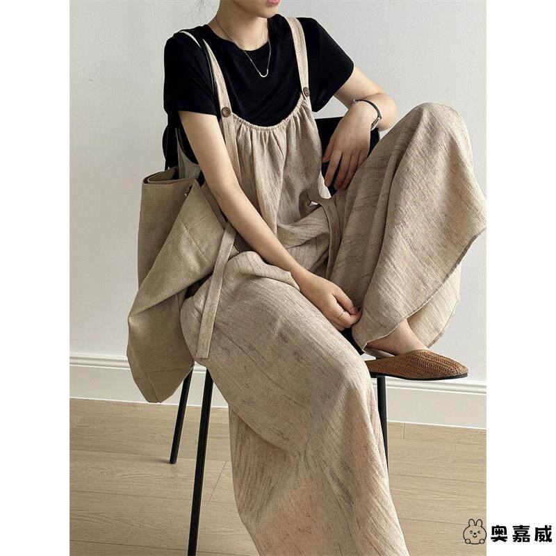 猫猫家加长女裤早秋新款棉麻质感高智风极简女收腰系带阔腿连体裤